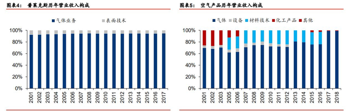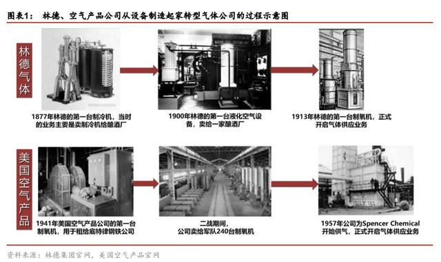 全球工业气体龙头均由国际领先的空分设备制造企业转型发展而来,从单一的装备制造到第三方工业服务的商业模式转变是这些企业成长为大市值公司的关键。二十世纪八、九十年代,国际上以法液空、林德、普莱克斯、空气产品为代表的空气分离设备领先制造企业纷纷加快向下游气体产品供应商的发展,经过数十年的发展,目前已经在工业气体的国际市场上形成了显著优势,气体业务已经成为上述公司最主要的收入来源。