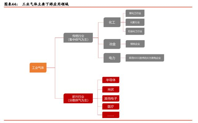 特种气体是工业气体的分支,其制备方式、应用领域等与以传统行业为主的大宗工业气体差异较大。通用气主要包括氧气、氮气、氩气等空分气体,以及乙炔、一氧化碳等合成气体,其产销量较大,但一般对气体纯度要求不高,主要应用于化工、钢铁、电力等行业;特种气体种类繁多,单一品种产销量较小,但根据不同用途,对不同纯度、组成、有害杂质允许的最高含量、产品的包装储运等都有极其严格的要求,属于高技术、高附加值产品,下游主要对应半导体、面板、光伏等新兴产业。