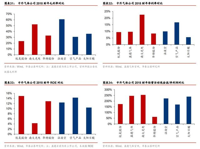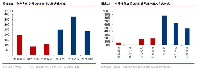 杭氧股份、盈德气体等本土企业经营活动现金流质量较高,与海外龙头在相近水平。随着本土企业气体项目布局已初具规模,气体业务“现金牛”优势显现。2018 年杭氧股份、盈德气体经营活动现金流/净利润达 173%、246%,与同期法液空、空气产品、大阳日酸的 223%、170%、239%已达到相近水平。本土企业的人均产值和国际化程度仍与海外龙头有着较大差距。相比于国内公司,海外企业产品品类更加全面,高附加值气体占比更高,2018 年杭氧股份人均产值达 195 万元,与海外公司仍存差距,分别为同期法液空、空气产品、大阳日酸的 77%、52%、83%。另一方面,本土企业目前仍立足于本土市场的国产化,海外收入占比较低,而海外龙头已由发源地走向世界,实现全球化布局。中国企业气体版图初具规模,迈过现金流拐点开启高速成长新阶段
