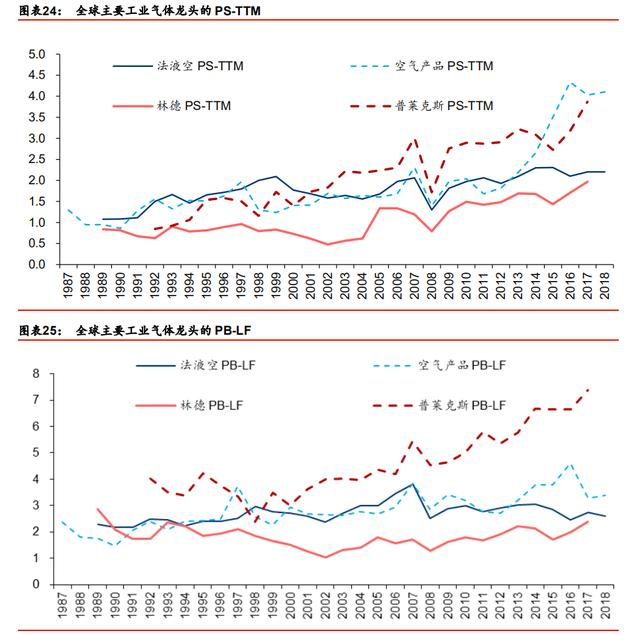 受益于独特商业模式所带来的长期稳健成长,市场长期给予海外气体龙头20 倍左右的 PE 估值且大多数年份保持相对稳定,1987~2018 年法液空、林德、普莱克斯、空气产品平均 PE(TTM)估值分别为 19.9、23.8、19.6、19.8 倍,波动范围分别为 14~24、11~63、14~54、14~27 倍。我们认为稳定的 PE 估值既反映了业绩增长的相对稳定性,也体现了海外市场对上述公司作为稳健成长股的认知。随着国内企业业务结构和商业模式与海外逐渐接近,海外估值水平或对本土企业产生一定的参考意义。
