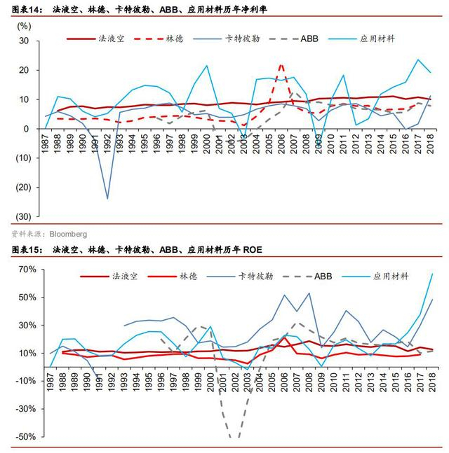 从利润角度来看,1987~2018 年上述公司利润波动幅度均大于收入端,在经济下行阶段,卡特彼勒、ABB、应用材料均曾于部分年份出现过亏损,而法液空、林德则始终保持盈利且波动幅度小于三家装备制造龙头。