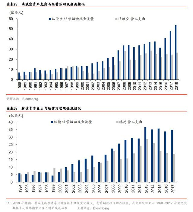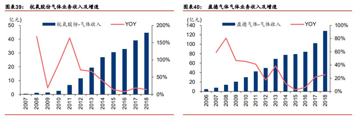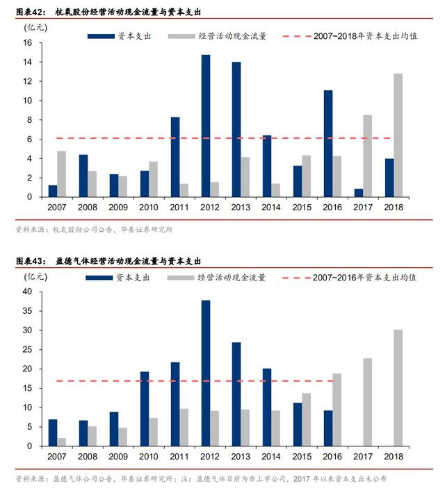 本土企业现金流循环渐趋优化,对比海外龙头发展历史,有望进入成长新阶段。与海外公司发展历程相似,杭氧股份、盈德气体在加大气体业务布局的初期均经历了资本开支大幅超过经营活动现金流量的发展阶段,这一时期企业现金流循环的压力较大,对外部融资的依赖度也较高。但随着两家公司气体空分项目的布局逐渐成形,公司经营活动现金流明显改善,2017、2018 年经营活动现金流均已超过 2007 年以来的资本支出年均值(盈德气体未披露 2017、2018 年资本支出,未计入)。我们认为,两家代表性本土企业正进入类似于海外龙头发展成熟期的现金流良性循环阶段,自有资金实力将不断增强,对项目扩张及资本支出方面的制约和对外部融资的依赖度减弱,本土企业有望迎来灵活、稳健、可持续的成长新阶段。