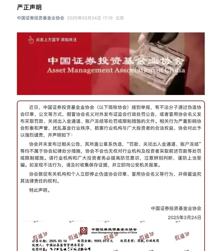 中基协严正声明称,不法分子通过伪造协会印章、公文等方式,假冒协会名义对外发布证监会行政处罚公告,或者冒用协会名义发布采取罚款、关闭出入金通道、账户冻结等处罚或限制措施的文件。