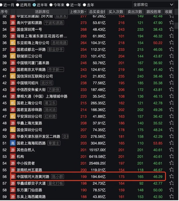 陈小群的常用席位为中国银河大连金马路营业部、中国银河大连黄河路营业部,尤其是大连黄河路席位,为龙虎榜常客,以最近半年来看,中国银河大连黄河路上榜次数为199次,总买入金额高达194.64亿元,在活跃席位中排第56名。