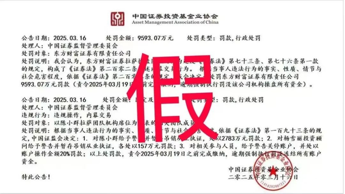 3月24日,中基协公告称,接到举报,有不法分子通过伪造协会印章、公文等方式,假冒协会名义对外发布证监会行政处罚公告,或者冒用协会名义发布采取罚款、关闭出入金通道、账户冻结等处罚或限制措施的文件。