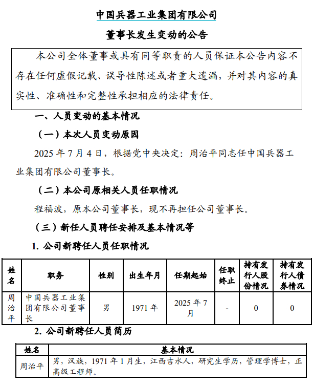 今日,中国兵器工业集团有限公司发布公告称,7月4日,根据党中央决定,周治平任中国兵器工业集团有限公司董事长,程福波不再担任公司董事长。