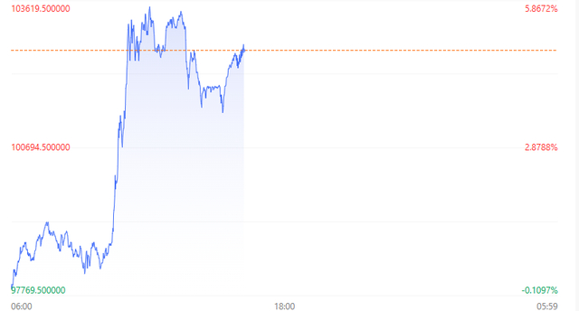 截至发稿,比特币涨4.93%,报102674.50美元。