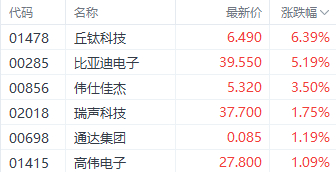 苹果概念股中,丘钛科技(01478.HK)、比亚迪电子(00285.HK)、高伟电子(01415.HK)分别上涨6.39%、5.19%、1.09%。
