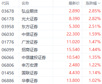 券商股中,光大证券(06178.HK)、东方证券(03958.HK)、中信建投证券(06066.HK)分别上涨2.82%、2.51%、1.35%。