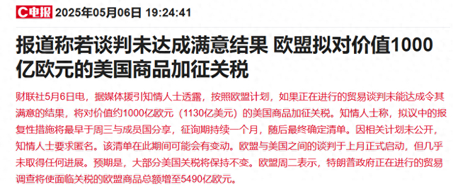 日内有消息称,知情人士透露,按照欧盟的计划,如果正在进行的贸易谈判未能达成令其满意的结果,欧方将对价值约1000亿欧元(约合1130亿美元)的美国商品加征关税。