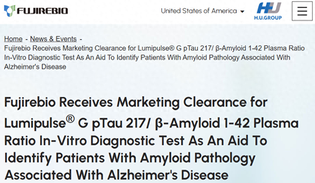 据了解,这款试剂为Lumipulse G pTau 217/β-淀粉样蛋白1-42血浆比值体外诊断(IVD),用于评估阿尔茨海默病和其他认知能力下降原因患者中的淀粉样病理情况。