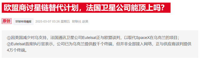 媒体分析称,法国政府已将Eutelsat视为欧洲在近地轨道卫星服务领域中最具竞争力的企业,也是对抗埃隆·马斯克“星链”(Starlink)项目、维护欧洲战略自主的重要工具。