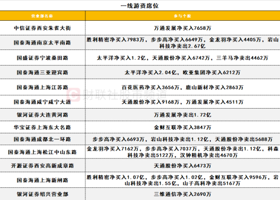 一线游资活跃度一般,岩山科技遭三家一线游资席位合计卖出5.34亿;太平洋获两家一线游资席位合计买入3.24亿。