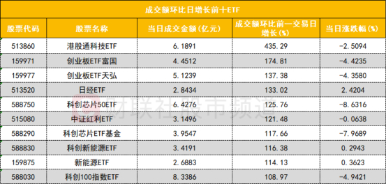 从成交额环比增长前十的ETF来看,港股通科技ETF(513860)成交额环比增长435%位居首位。