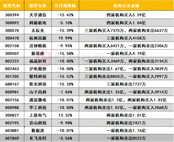 卖出方面,沪电股份遭机构卖出1.67亿;数据港遭机构卖出1.76亿;山子高科遭机构卖出1.35亿。