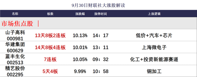财联社9月30日讯,今日52股涨停,23股炸板,封板率为69%,蓝丰生化7连板,华建集团4连板,天际股份3连板,冠中生态20cm2连板,山子高科13天8板,精艺股份5天4板,中电鑫龙7天4板,通润装备5天3板,合锻智能7天3板。今日盘面上,沪深两市成交额2.18万亿,较上一个交易日放量200亿。市场热点题材反复活跃,有色金属、存储芯片板块涨幅居前,白酒、大金融等板块跌幅居前。截至收盘,沪指涨0.52%,深成指涨0.35%,创业板指涨0.00%。