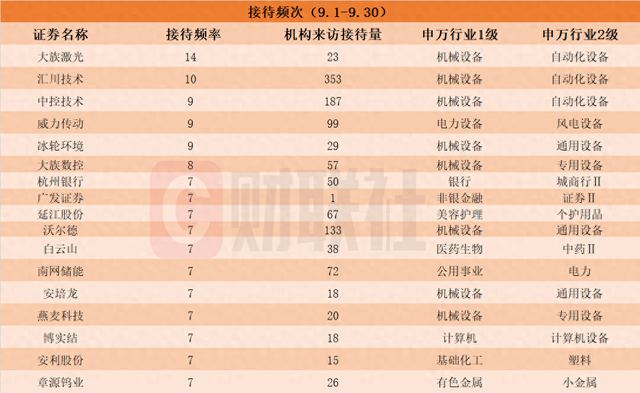 财联社10月7日讯(编辑 若宇)据Choice数据统计,沪深京三市9月(9.1-9.30)共有2027家上市公司接受机构调研。具体来看,接待机构调研次数最多的上市公司是大族激光达14次;汇川技术位列第二,接待次数为10次;中控技术、威力传动和冰轮环境紧随其后,接待次数为9次。具体详见下图: