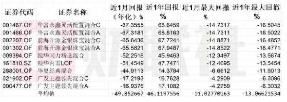 值得警惕的是,部分基金的单月回报跌幅与最大回撤数据出现明显背离。以华富永鑫灵活配置混合C为例,近一月回报为-67.36%,而同期最大回撤仅为-14.73%;前海开源金银珠宝混合A也呈现类似特征,近一月回报为-65.58%,最大回撤为-14.85%。