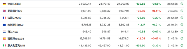 正在交易的欧洲股市涨跌不一,德国DAX指数现跌0.55%,英国富时100指数涨0.41%,法国CAC40指数跌0.29%。