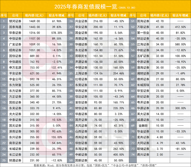 2025年券商发债呈现明显的头部聚集特征。wind数据统计显示,全年共有6家券商境内发债规模突破千亿元,较2024年的2家大幅增加。其中,银河证券以1469亿元的发行规模位居首位,国泰海通、华泰证券分别以1443亿元、1316亿元紧随其后,中信证券(1107亿元)、广发证券(1059亿元)、招商证券(1051亿元)也跻身千亿发债阵营。