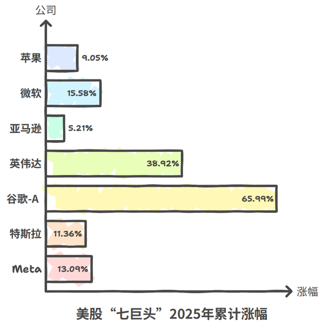 从全年表现来看,科技“七巨头”中除了谷歌和英伟达外,其他5家在2025年都没跑赢基准指数。