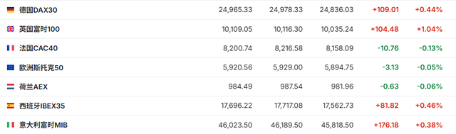 正在交易的欧洲股市涨跌不一,德国DAX指数现涨0.44%,英国富时100指数涨1.04%,法国CAC40指数跌0.13%。
