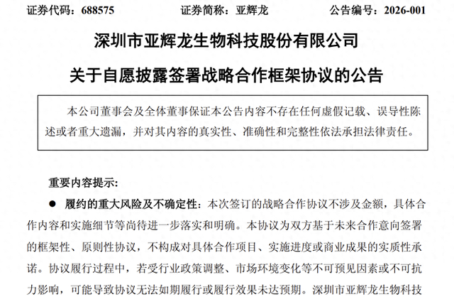 再接着,亚辉龙又发布了一份补充公告,提示上述签署的协议为战略合作意向的框架性协议,尚无实质性合作内容,后续业务合作的具体实施内容和进度将以另行签订的实际业务合同为准,协议的执行情况还存在较大的不确定性。
