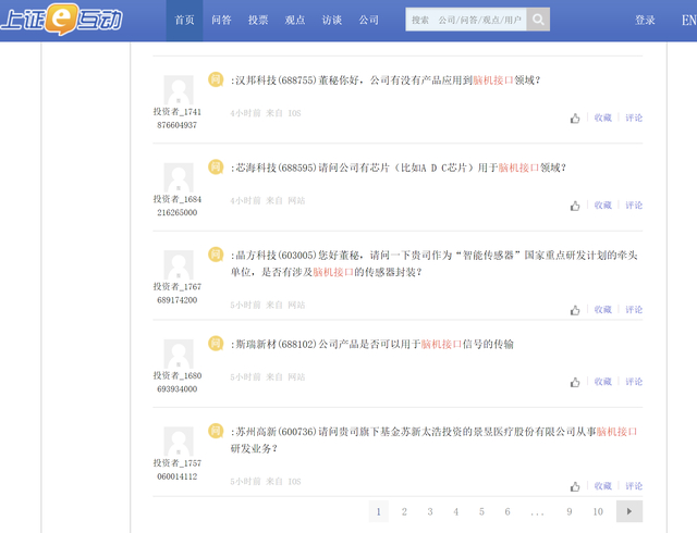 随着上述消息传入国内资本市场,在上证e互动平台上,大量投资者聚焦脑机接口赛道,向相关上市公司就业务是否涉及脑机接口业务布局展开了密集提问。