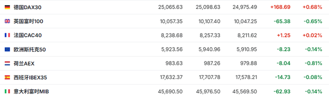 正在交易的欧洲股市涨跌不一,德国DAX指数现涨0.68%,英国富时100指数跌0.65%,法国CAC40指数涨0.02%。