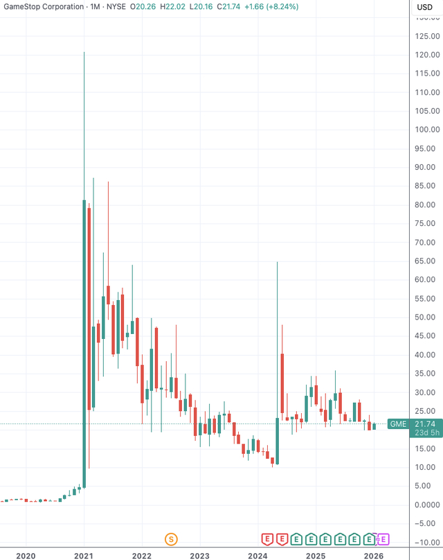 在2021年头一个月里,游戏驿站的股价从不到5美元一路狂飙至最多120美元,市值最高达到340亿美元。