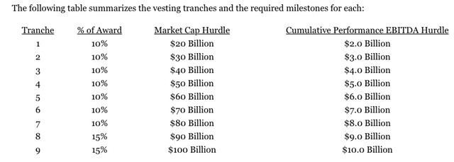 (游戏驿站日线图,来源:TradingView)根据奖励计划,该计划有两个关键指标:市值和累计EBITDA(息税折旧摊销前利润)。奖励总共分为9档,最低一档门槛为200亿美元市值和累计20亿美元EBITDA,后续8个档次依次提升100亿美元市值和10亿美元EBITDA。前7档分别解锁10%的期权奖励,最后两档各解锁15%奖励。