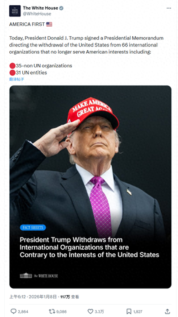 财联社1月8日讯(编辑 黄君芝)据央视新闻报道,当地时间7日(周三),美国白宫发布声明表示,美国总统特朗普当日签署了一份总统备忘录,指示美国退出66个“不再符合美国利益”的国际组织。