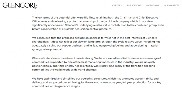 与力拓简单表示“无法达成能为股东创造价值的协议”不同,嘉能可详细描述称,在拟议的合并要约中,力拓要求其董事长和首席执行官继续担任新公司的对应领导位置,同时给予嘉能可的备考持股比例,严重低估嘉能可在合并集团中的相对内在价值贡献,而且连收购控制权的溢价都没给。