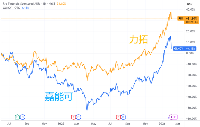 不过随着嘉能可去年宣布战略转型、全力加码铜矿业务后,今年以来的股价涨幅明显强于力拓。以1月发布公告前的最后一个交易日收盘价计算,力拓美股当时的市值为1368亿美元,到本周三市值达到1567亿美元。同一时期内,嘉能可市值从661亿美元最高涨至822亿美元。