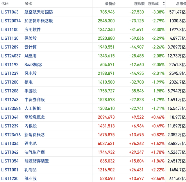 其他方向上,加密货币概念跌幅居前,黄金、有色板块继续下行。此外,大金融、游戏、半导体、软件、新能源等行业纷纷走跌。