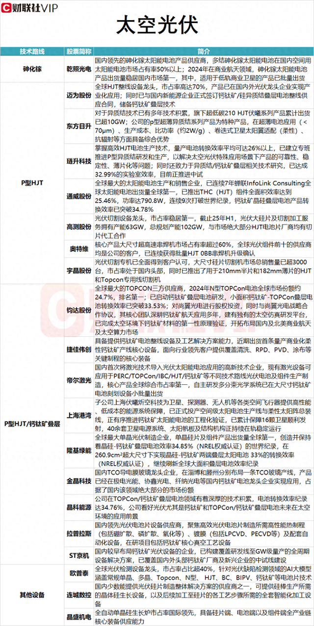 据财联社VIP盘中宝•数据栏目此前梳理,太空光伏产业链中,P型HJT/钙钛矿叠层这一技术路线涉及的上市公司包括钧达股份、捷佳伟创、帝尔激光、上海港湾、隆基绿能、金晶科技、晶科能源、拉普拉斯和ST京机,具体情况详见下图: