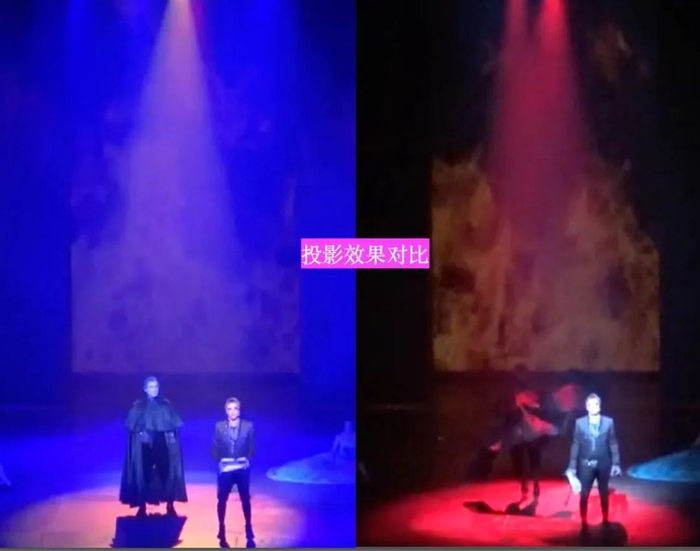 在右边的版本中,火焰效果以及颜色的呈现是清晰明了的;而左边火焰的效果比较模糊,在泛光的效果下观众不太容易分辨出背景的图案。这样版本对比的分析,也为音乐剧《摇滚中文版》的整个制作团队,提供了更加明确的制作方向。