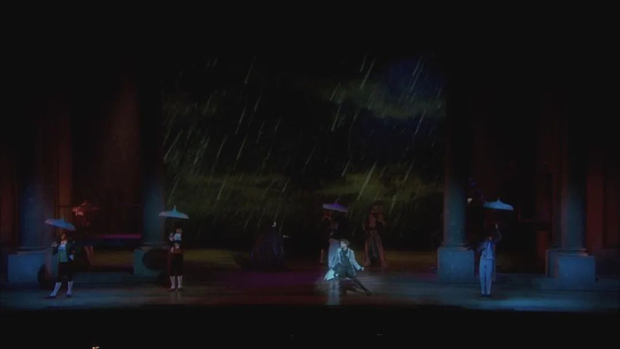 在“雨中”这个场景里,巴黎原版只是在背景中做了一些雨的感觉。那么随着这几年技术的升级与更新,整个的投影设计会倾向于把雨的感觉在整个舞台上加强,烘托出莫扎特在雨中的悲伤氛围,进行更“沉浸式”的表达。