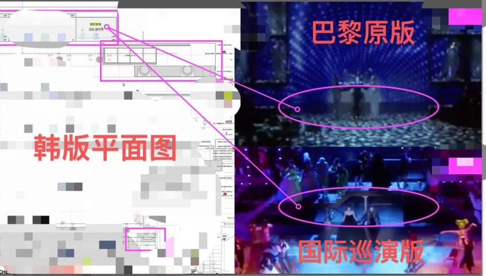 而巴黎原版(右上)则是采用了一块平的地板,但设置了一个灯具,这也是结合体育馆环境的调整。