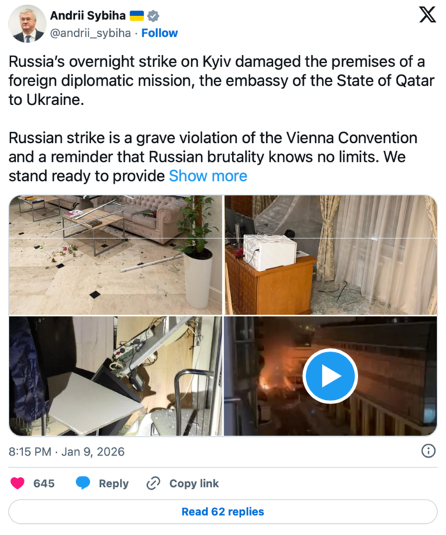 卡塔尔外交部在社交媒体平台X上发布的声明称:“卡塔尔对昨晚基辅首都遭袭导致驻乌大使馆建筑受损深表遗憾,同时确认外交官及使馆人员均未受伤。”
