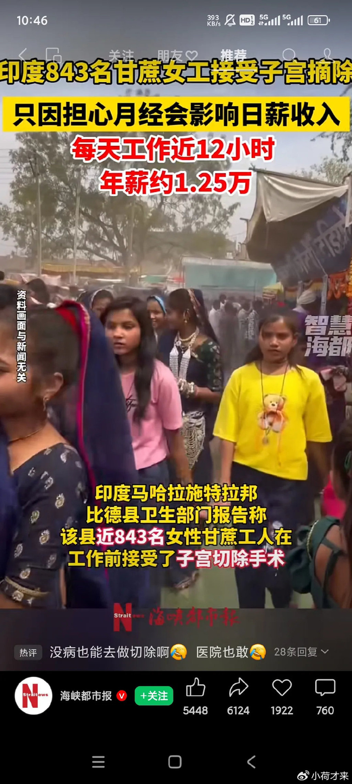 现在为了上班都这么恐怖的吗,印度843个甘蔗女工为了全月上班,不影响挣工资,嘎掉了自己的子宫,这样就可以不来姨妈,身体是自己的,无可指摘,但是为了赚钱,现在可以摘掉子宫,以后还能失去什么,这真是恐怖片都拍不出来的压抑感。