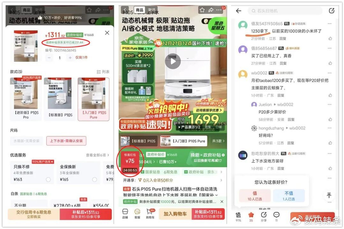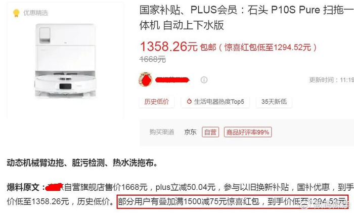 根据张大妈爆料,狗东活动价1668元的石头P10S Pure扫拖一体机(自动上下水版),通过多重优惠实付1358.26元,部分用户还可以叠加满1500减75的惊喜红包,到手价低至1294.52元,目前该爆料点值率是91%。