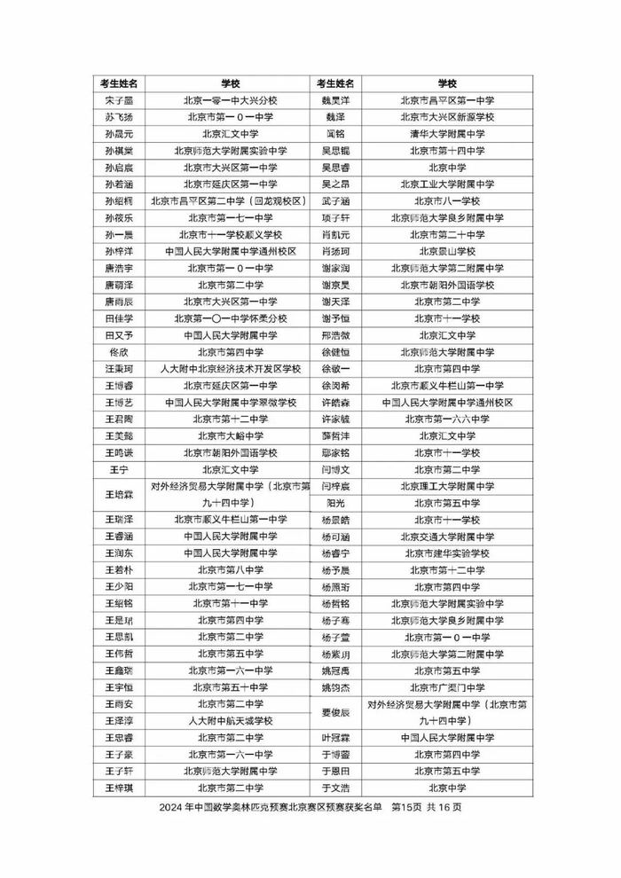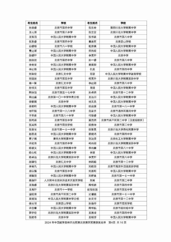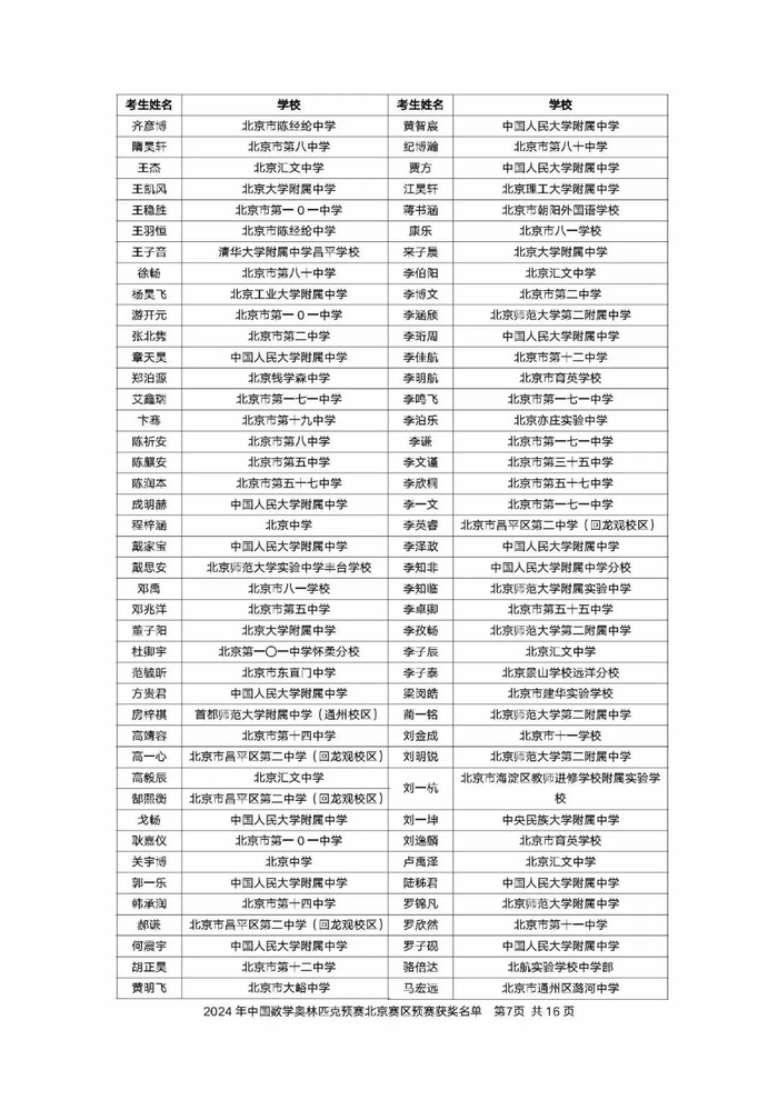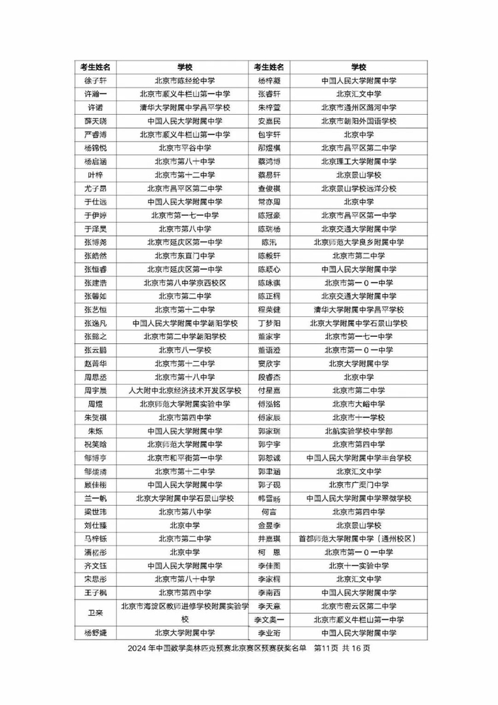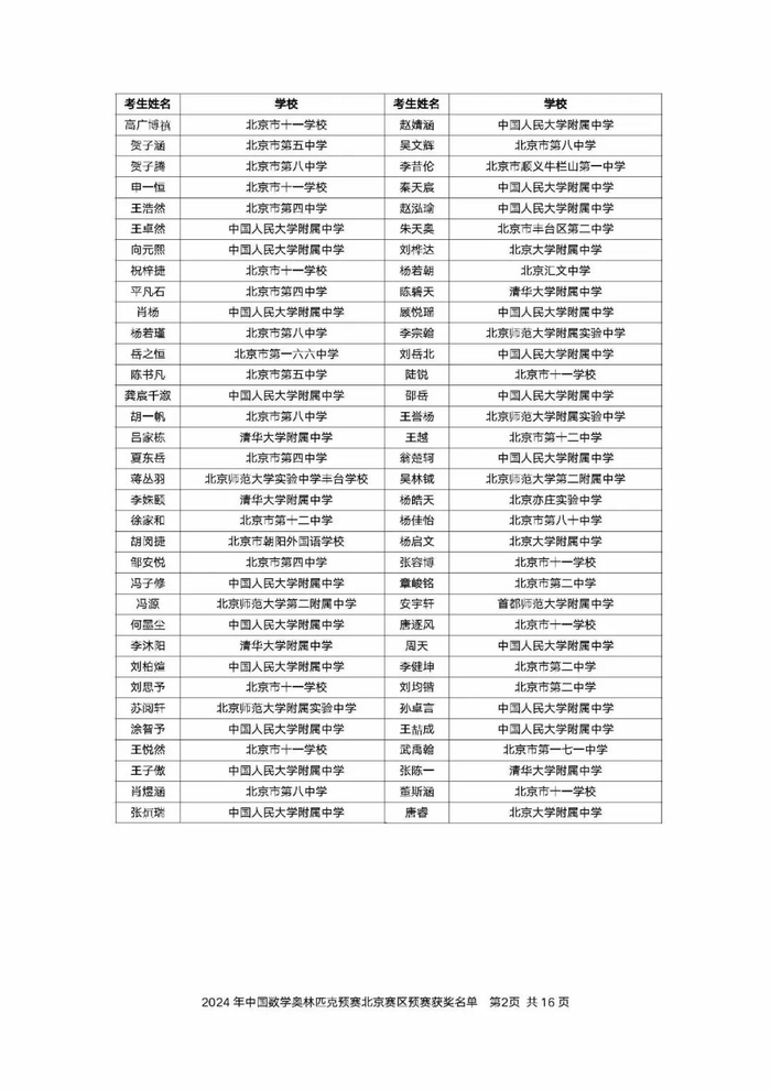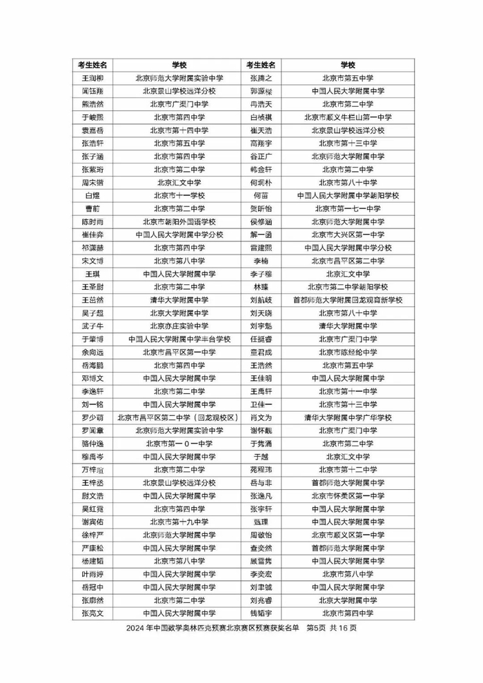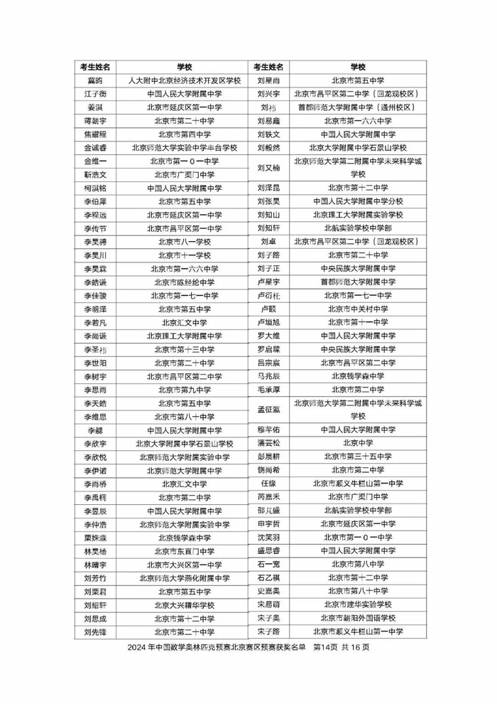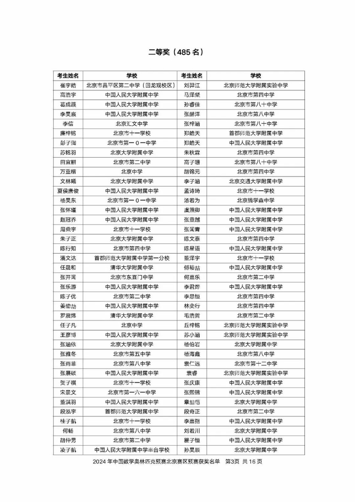 2024年中国数学奥林匹克预赛北京赛区预赛获奖名单现已出炉,142人获得一等奖,485人获得二等奖,614人获得三等奖。