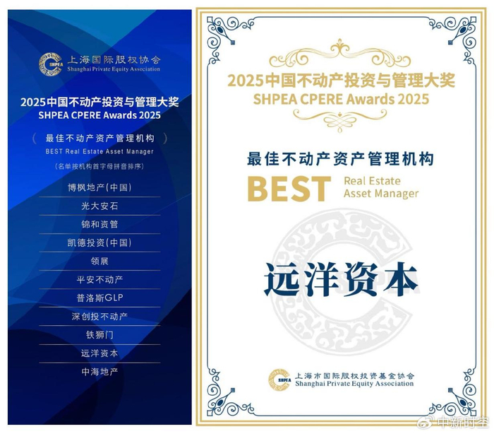 近日,凭借在不动产资产管理领域的专业能力,远洋资本获得“2025年度最佳不动产资产管理机构”。该奖项由上海国际股权投资基金协会(SHPEA)颁发,聚焦不动产行业“存量提质”与“新动能培育”的发展主线,以专业视角遴选在投资管理、创新实践、可持续发展等领域表现卓越的公司与机构。