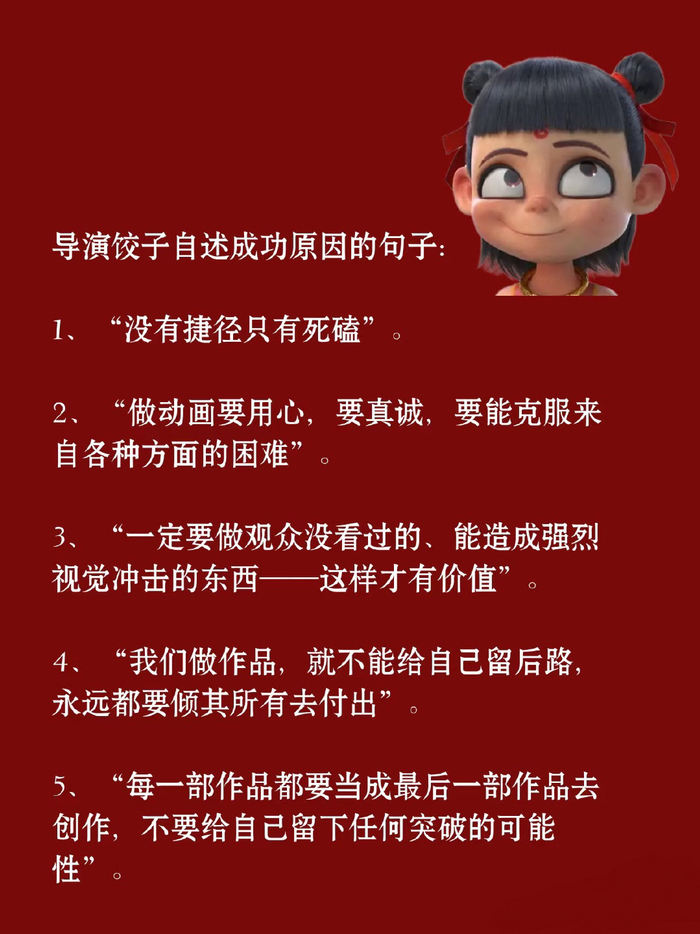 饺子曾说:“在漫长的独自奋斗岁月里,我常常问自己,如果坚持了这么久,最终却一无所获该怎么办?我的内心告诉我,其实我已经收获了很多,创造一个作品的过程本身就是独一无二的宝贵财富。”这种对梦想的坚持和对自我的突破,正是他成功的关键。