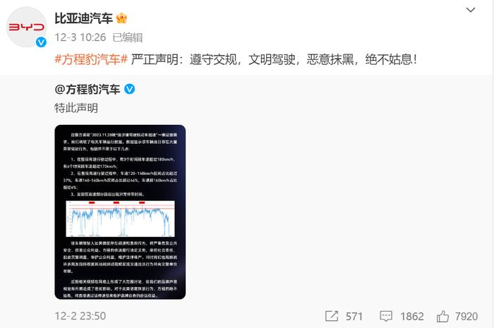 紧接着,比亚迪就转发了方程豹的声明,并且表示,恶意抹黑,绝不姑息!