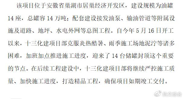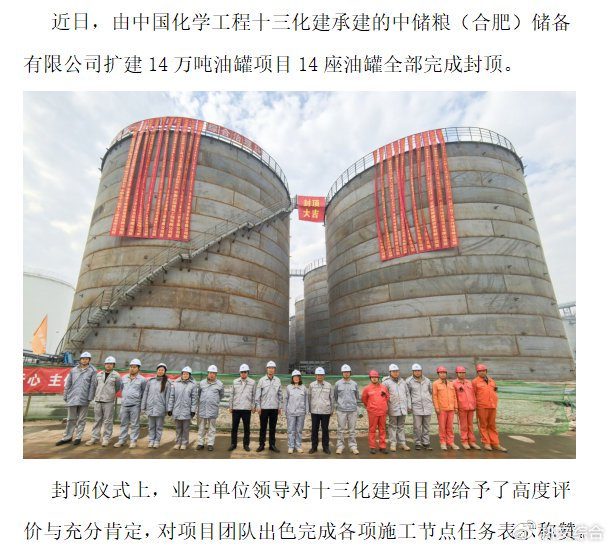 中国化学工程十三化建中储粮(合肥)14万吨油罐项目封顶完成
