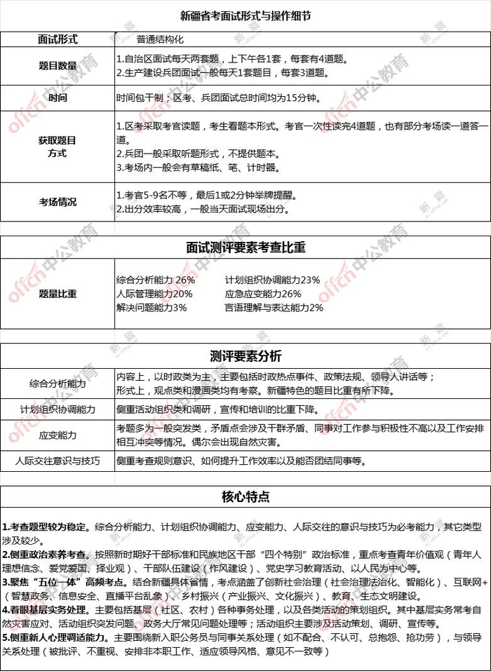 省考成绩正式发布,小编给大家科普下省考的面试考情,以及和兵团公务员的区别,方便考生的更好的备考。由新疆中公教育通过历年面试考生反馈进行的考情总结: