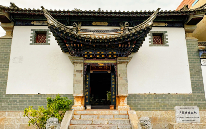 在玉溪市区东南郊,沿秀山路盘山而上,经上灵秀村继续前行,抵达下灵秀村,在一片干净整洁的民房之中,可以看到一座稍显不同的建筑,门口端坐着两尊石狮子。拾级而上,抬头便可看到一块匾额写着“陈公祠”三个大字,门楣两边的对联则写着“岳河钟瑞兄弟联芳,凿山导水利济悠长”。