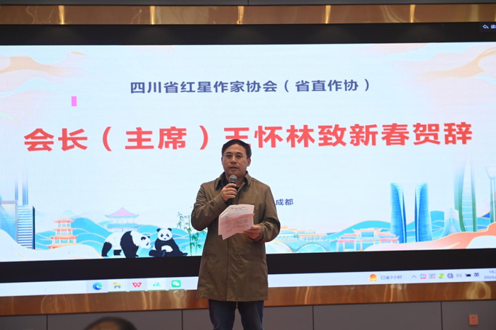 四川红星(省直)作协主席王怀林在新春致辞中,回顾了2025年协会围绕省作协中心任务完成的各项工作和取得的重要成绩,同时谈到人工智能对文学带来的挑战。他表示,今年,红星(省直)作协将整合社会资源,让文学与文旅、科技、教育深度融合,把“文学+”做实,让文学作品转化为实实在在的文化生产力。